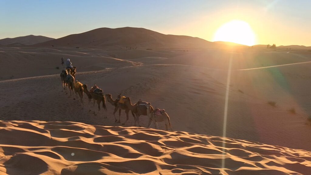 Step into the heart of the Sahara and experience its timeless beauty on a camel ride through the golden dunes of Merzouga. Traveling atop these iconic desert companions, you’ll follow ancient nomadic routes, surrounded by the profound silence and ever-shifting sands of Erg Chebbi. This journey is more than a simple excursion it is a deep immersion into the soul of the desert.